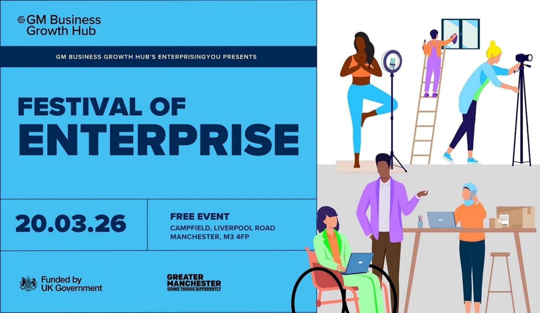 If you’re starting a business, developing an idea or scaling with a team in place, the Festival of Enterprise on 20th March 2026 at Campfield is the event you can’t afford to miss. This one-day festival brings together entrepreneurs, freelancers, founders and small business owners from across Greater Manchester for a high-energy day of inspiration, learning and real opportunities to grow.