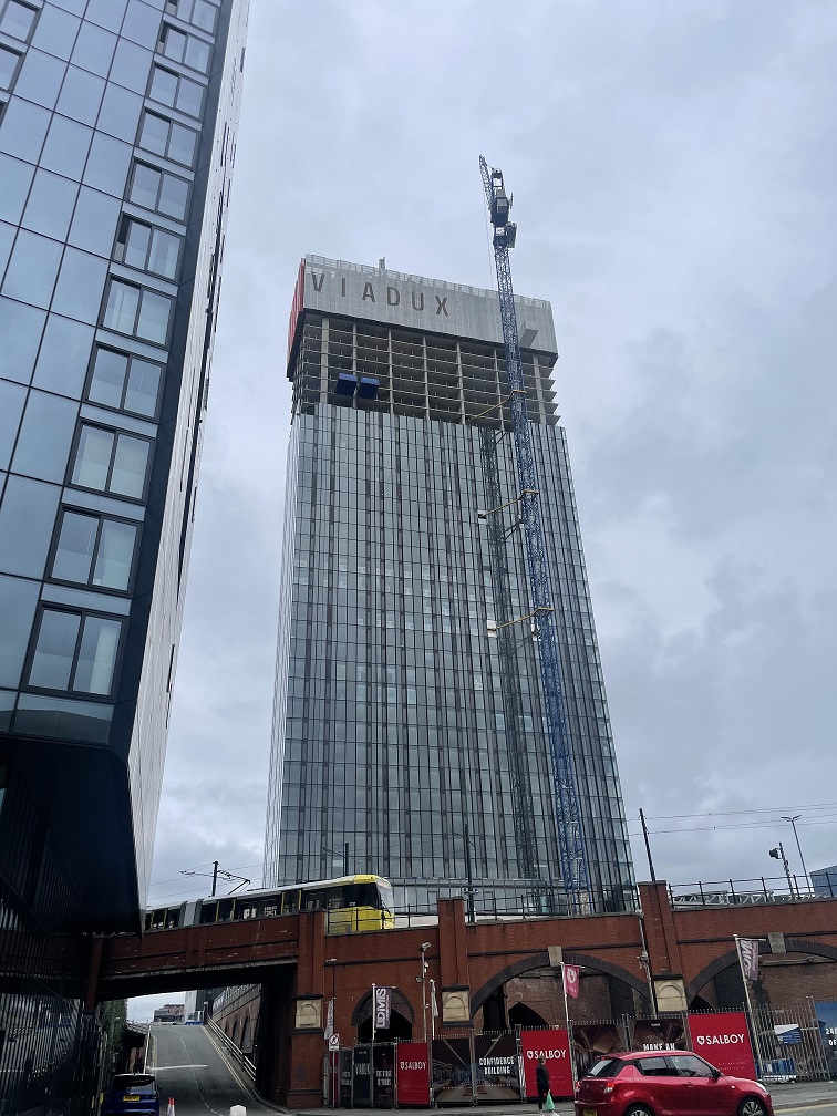 Phase 1 of the Viadux development consists of a 40-storey residential tower built over and through the Grade II listed viaduct at the rear of Manchester Central Convention Centre (MCCC).